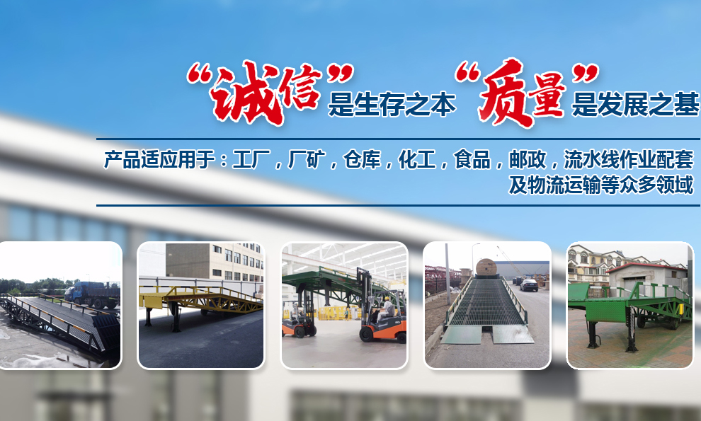 隨著國內(nèi)及國際市場需求的不斷擴(kuò)大,公司也在不斷引進(jìn)國內(nèi)外的先進(jìn)技術(shù)來充實(shí)自身。公司先后設(shè)計(jì)研發(fā)出了,大小型貨車配裝的:汽車液壓尾板,叉車裝卸貨用的:移動(dòng)式登車橋;庫房外貨臺(tái)配裝的:固定式液壓升降平臺(tái)(貨臺(tái)高度液壓調(diào)節(jié)板);庫房內(nèi)外高層輸送貨物:導(dǎo)軌式升降貨梯,液壓升降平臺(tái),旋轉(zhuǎn)液壓升降臺(tái),及百噸位大型升降臺(tái),等多種的先進(jìn)裝卸裝備,適應(yīng)用于:工廠,廠礦,倉庫,化工,食品,郵政,流水線作業(yè)配套及物流運(yùn)輸?shù)缺姸囝I(lǐng)域。